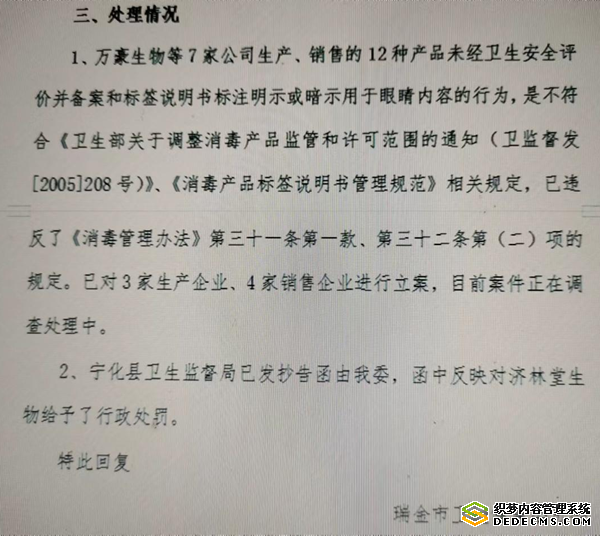 2、宁化县卫生监督局已发抄告函由我委,函中反映对济林堂生物给予了行政处罚。