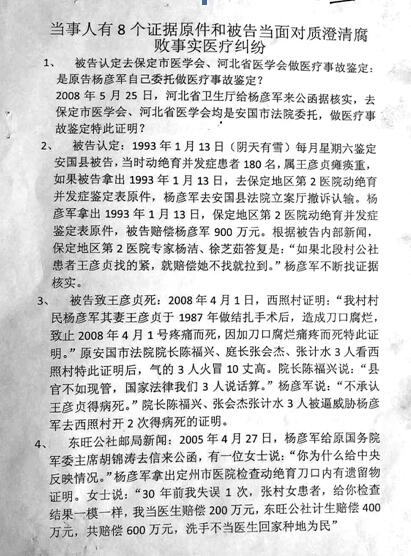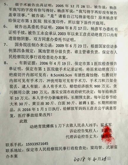 本站讯 2018年4月25日,媒体再一次接到河北安国杨彦军的实名制举报:1987年9月1日,河北安国计生委服务站为其妻子王彦贞女士( 30岁)做绝育手术,因医务人员玩忽职守,严重渎职,将手术刀遗留在王女士的腹中,而且两根神经被割断,造成20多年的腹痛难忍,瘫痪,伤口感染严重感染,终于在2008年4月1日因刀口腐烂疼痛而死。一刀毙命,家破人亡,灭顶之灾,杨彦军三十余年的漫漫上诉上访路,充满坎坷心酸,他四处奔走上告,变卖全部家当,现在家贫如洗,只因腐败在蔓延,冤案依然在继续!接近古稀之年的杨彦军已是满头白发,满目愁容的他声泪俱下,愤慨的倾诉他的悲惨遭遇.....