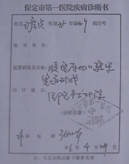 保定第一医院诊断书这样写:腹部原刀口感染,窦道形成。