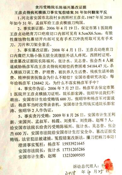 但是,他们不愿意承担巨额赔款和法律刑事责任,于是安国计生委服务站站长赵辉(原安国县委副书记赵国武之子)弄虚作假,勾结买通法院、医院,掩盖事实真相,相互推脱,拖延时间,把一个十分明显的重大医疗事故,编造成有一定责任的绝育手术,王彦贞含恨离开人世也死不瞑目,致使这期冤案长达27年之久至今未了!