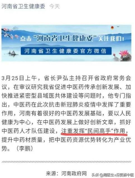 3月25日,河南省省长尹弘在省政府常务会议上专门指出:中医药在此次抗疫中发挥了重要作用,河南有着很好的中医药发展基础,要以人民健康为中心,在中医药发展上做好创新文章,抓好中医药人才队伍建设,注重发挥“民间高手”作用,提升中药材质量,把中医药资源优势转化为产业优势。