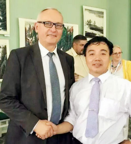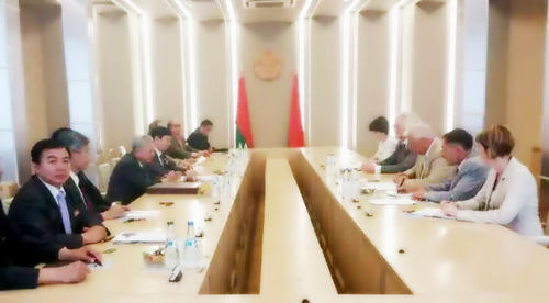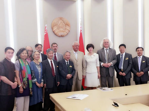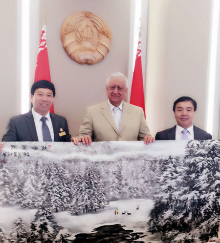 2015年7月6日白俄罗斯明斯克下午两点,北京时间下午七时许,白俄罗斯共和国议会议长米亚斯尼科维奇,中国驻白俄罗斯大使崔启明在白俄罗斯议会大厦亲切亲见姚治华、陈谋、敖特、刘瀚锴等中国书画家代表团。