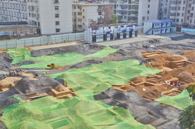今日上午11时许,笔者赶到现场,看到学校大门紧锁,随后笔者又来到该小学西侧一家属院,站在居民楼顶看到,工地内挖出有很多长方形的墓穴,密密麻麻的。这些墓穴被文物部门工作人员统一覆盖上绿色防尘网予以保护。