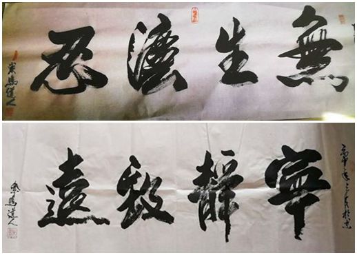为了加强自身素质的修养,促进社会正能量的传播力度,近几年我加深对书画功夫的学习与研修。在学习修练中我继续寻高人,拜师学艺,不忘先师们的教诲。1985年至1988年间,我曾拜甘雨辰、朱浩峰、周昔非、孙吉安等德才兼备的书画界名家为老师,系统学习过国画。在众家师父的培养与点拔下,结合自我对书画艺术的认识与拓展,以佛、道两家偈诵为主旋律,并有机地融合两家特色,同时渗入前师的书画艺术精髓,自成体系形神兼备。