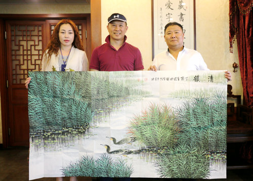 董铁棍夫妇向金波赠送陈老春国画白洋淀表示祝贺