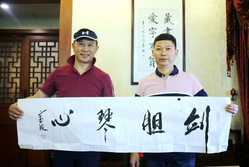 金波向新收的徒弟杨照文赠送《剑胆琴心》书法作品以示鼓励