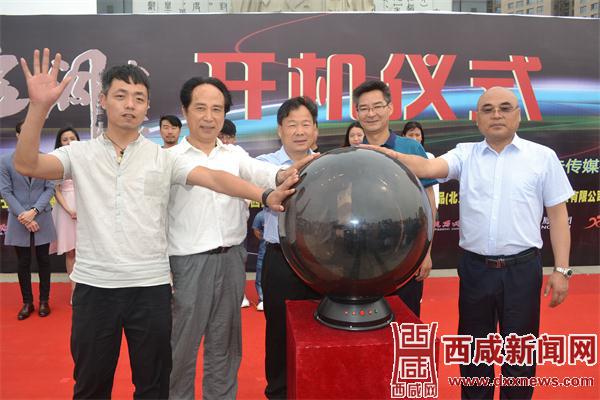 制片人马可非、导演孙思伟、原咸阳市广电文化新闻出版局局长闻俊辉、渭城区文体事业局局长郭增勇与西部艺术团团长、毛主席特型演员宋晓飞一起按动启动球