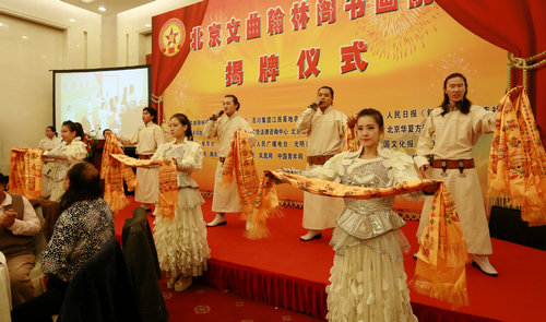 揭牌和授牌仪式结束后,我国著名的东方神骏乐团分别以《万马奔腾》、《祝酒歌》、《每当》;全总文工团著名歌唱家刘国强亲情演唱《感谢你》;著名歌唱家大宏激情演唱《向天再借五百年》等多经典首曲目向北京文曲翰林阁书画院成立表示祝贺。