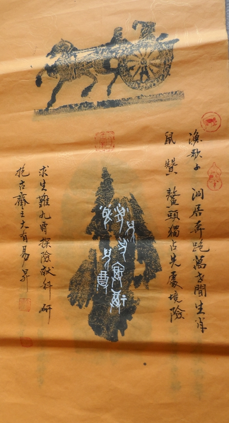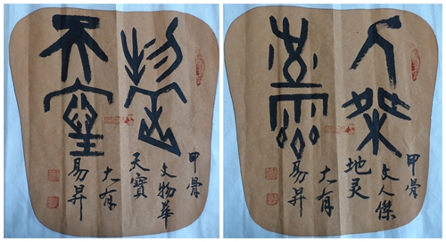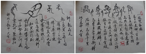 他所创作的甲骨文作品四条屏《岳阳楼记》和10米长卷《桃花源记》都很具有创意。他所创作的作品,将甲骨图形复制于纸上,又把文字书于其上。纵观其作形式古朴,章法严谨,疏密有度,取法精致,令人观之赏心悦目,品之意蕴无穷,彰显了中华几千年优秀历史文化的博大精深的风范和深厚的底蕴。