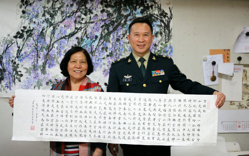 火箭军文工团著名歌唱家金波向张秀进赠送自己抄写的《吉祥经》