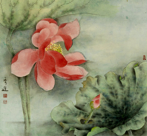 张秀进的绘画风格多样,题材广泛,山水风光,花鸟人物都是她笔下描绘的主题。她的工笔画或写实或夸张或抽象,无论是写实还是写意,都表现得恰到好处。在张秀进的绘画作品中,荷花尤为突出,她笔下的莲花,光彩奕奕,栩栩如生,构思别致巧妙,色调清丽冷艳,用笔洒脱飘逸,营造出一派空潆的韵味。