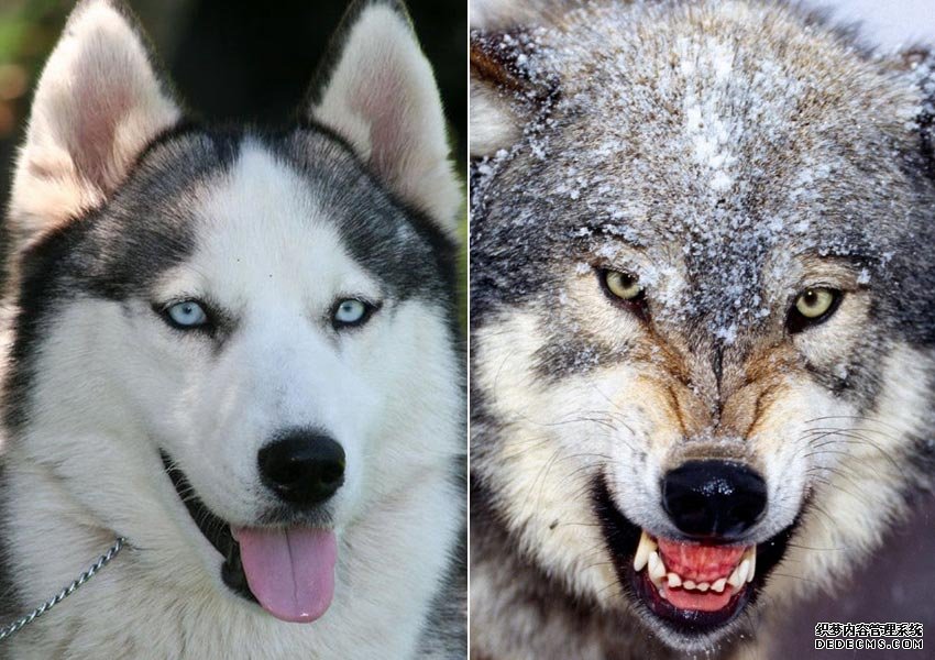一、哈士奇眼睛带圈呈双眼皮,同时狼的眼睛是倾斜向上近45度角,二是尾巴狼多数是夹着的,哈士奇是卷起的,三、狼的前腿壮且力大,哈士奇四腿相对均匀。四、哈士奇的毛各种颜色都有,不具保护色,狼的背部是保护色。狼和哈士奇的基因相似度达99%,区别关键看眼睛。