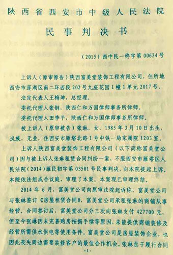 原告陕西富美堂装饰工程有限公司于2014年1月13日向被告张琳租赁临街商铺一套,该商铺位于西安市中铁尚都城7-03号,同日双方签署了《房屋租赁合 同》并将42.7万元一年租金提前交付。待原告准备进驻装修时,该房屋内依旧没有通水通电,无法正常装修和使用。原告多次与被告交涉未果,且被告无故拒绝 退回租金。长期拖延后原告忍无可忍的情况下,于2014年6月2日将被告诉至西安市雁塔区人民法院。