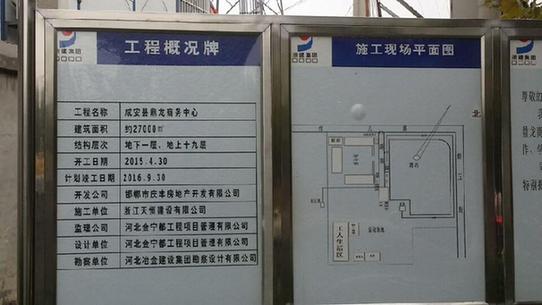 10月26日上午,记者在项目所在地商城工业区纬八路南侧看到,“鼎龙商务中心”项目整栋大楼已经建至六层,项目已经停工,工地大门紧闭,没有施工人员出入,周围显得一片冷清,在项目部大门右侧一个工程概况牌上显示:“项目开发公司为邯郸市庆丰房地产开发公司,施工单位为浙江天恒建设有限公司,开工时间为2015年4月30日,计划竣工时间为2016年9月30日。”