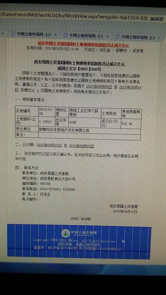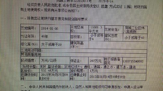 经记者查询得知,成安县国土资源局经成安县人民政府批准,发布成国土告字【2015】011号公告,宗地编号是2014-01-08号,面积为11001.3平方米,宗地坐落于商城工业区纬八路南侧;是于今年9月中旬被当地一家名为邯郸市庆丰房地产开发公司竞标获得,成安县国土局供地结果明确显示:“约定交地时间为2015年10月9日,约定开工时间为2016年2月25日”。然而,成安县国土局发布公告称该宗地“五通一平”,所谓的“净地”出让实际上多宗土地早已被邯郸市庆丰房地产开发公司占用开发成为了成安县“鼎龙商务中心”项目,且该宗土地中标的价格为”零加价”中标。业内人士指出,该项目已经涉嫌暗箱操作,可能会致使国有资产大量流失。