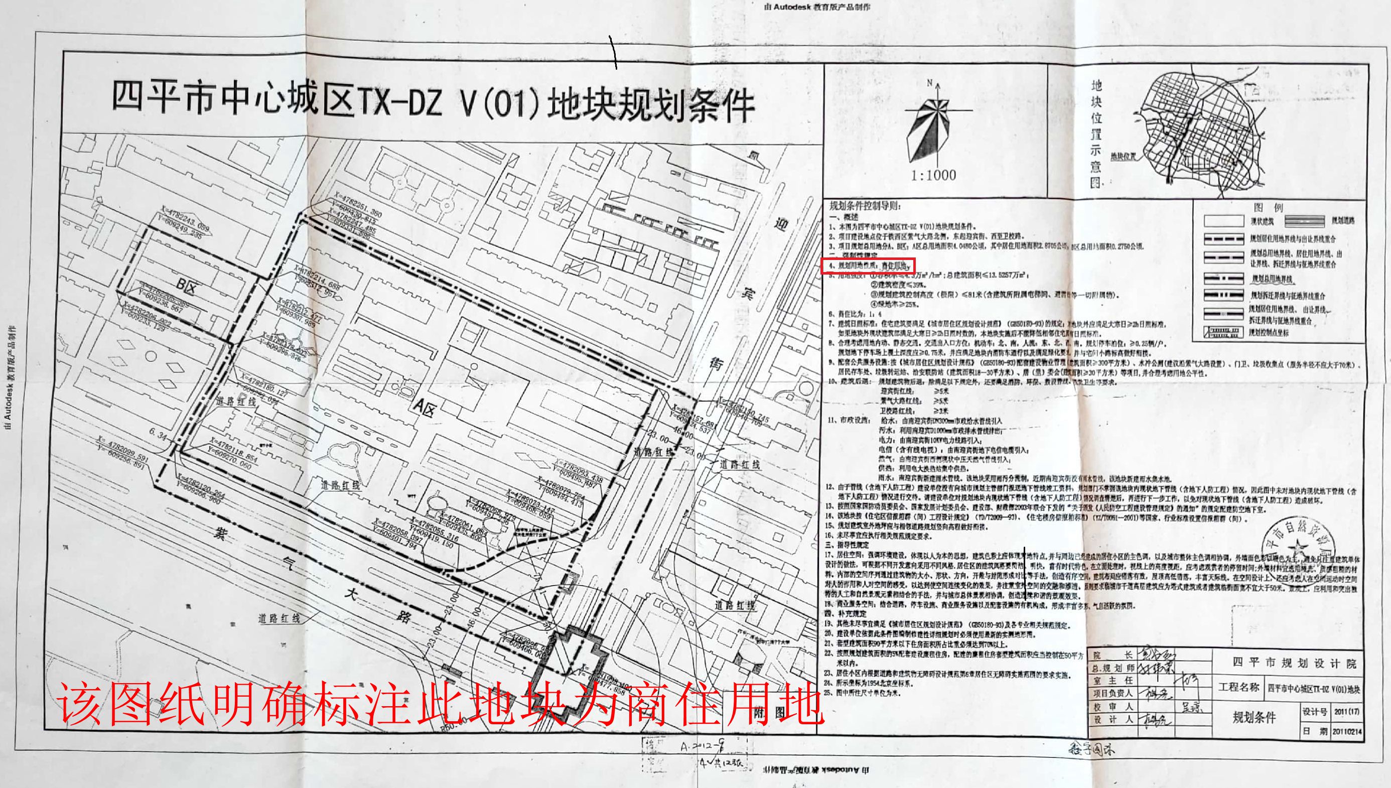 商户和住户们提供的由四平市规划设计院做出并加盖四平市自然资源局公章名为《四平市中心城区TX-DZV(01)地块规划条件》的图纸复印件显示,其规划用地性质为“商住用地”,但是铁西区政府下发的所有关于此地块征地用途均称其为“公共利益建设”,于是此地块所有的征地均按照公益用地补偿。他们说:这次被征地块原建筑建于1998年,紧邻紫气大路,与四平市政府隔路相望,现已成为四平市的一类地区一类地段,设计图纸上记载的是商住用地,铁西政府却以公益性用地征收,并按公益性用地给予补偿,超低的补偿价格征收,违背了国务院590号令,因此大家有意见,此次征地也因此搁浅了几年。