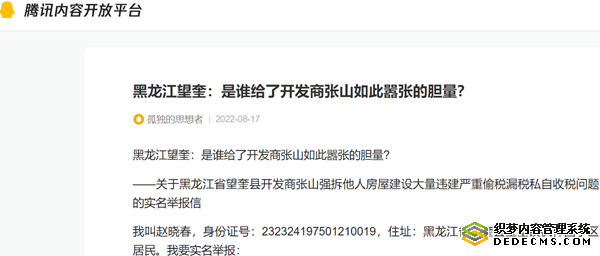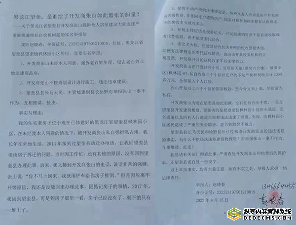 ——关于黑龙江省望奎县开发商张山强拆他人房屋建设大量违建严重偷税漏税私自收税问题的实名举报信