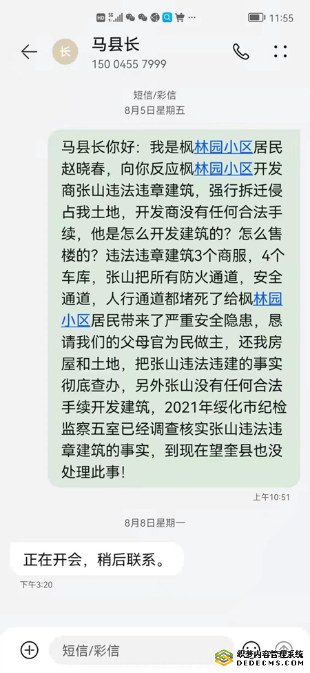 我先后找各主管部门帮我解决房子被强拆的事情,一直没有给予答复。因北京家里有急事,我不得不将房子的事情暂放。今年疫情稍有好转,我特意回来办理房子被强拆的事情。于是,我给望奎县县长马天民打电话、发信息说我房子被开发商张山强拆侵占了。在我房子原来的土地上盖了违法违章建筑商服。然后,马县长让我找主管城建的副县长徐野反映情况,徐野让我找拆迁办,拆迁办让我自然资源局,自然资源局又让我找综合执法局,最后又甩锅到规划局。总之,望奎县各个部门我都找遍了,也没有人给我解决问题、到处推诿不作为至今无果。后来,我又给马天民县长打电话,电话不接、信息不回、人也不让见。无奈之下,我又向望奎县主管城市建设的副县长徐野反映开发商张山违法违章建筑问题。