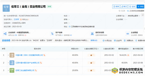 企查查显示:伍零三(全南)实业有限公司法人代表是王启军,注册资本10686万元人民币,股东有中盈华夏(深圳)投资集团有限公司(持股比例40%)、江西中盈华夏文旅产业有限公司(持股比例40%)、伍零三实业有限公司(持股比例20%)。