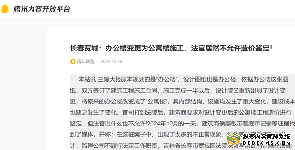本站讯 三幢大楼原本规划的是“办公楼”,设计图纸也是办公楼,依据办公楼这张图纸,双方签订了建筑工程施工合同,施工完成一半以后,设计院又重新出具了设计变更,将原来的办公楼改变成了“公寓楼”,其内部结构、设施均发生了重大变化,建设成本也随之发生了变化。官司打到法院后,建筑商要求对设计变更后的公寓楼工程造价进行鉴定,但法官说什么也不允许!2024年10月的一天,建筑商侯惠敏带着庭审记录等证据找到了媒体,并称:在这桩案子中,出现了太多的不正常现象,设计院私自篡改规划设计,监理公司不履行法定工作职责,吉林省长春市宽城区法院法官李洪武有涉嫌枉法裁判的嫌疑。