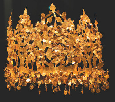 关于希腊化到贵霜时期之间的文明延续问题,一直是学界讨论的重点。由于没有发现希腊城邦灭亡后文化延续的遗址和考古学证据,有人悲观地认为这段游牧民族统治时期是阿富汗文明史的黑暗阶段,直到蒂拉丘地黄金宝藏的发现,才改变了这一观点。展览中呈现的蒂拉丘地黄金宝藏,讲述了这段历史。