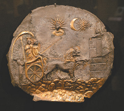 在展览中,最重要的一件文物是描绘希腊自然女神西布莉的镀金银盘。西布莉骑在一辆由两个狮子牵引的战车上,她手握缰绳,旁边是女神耐克和祭司献祭,太阳神赫利俄斯、新月与星星一起出现天空中,显示出自然女神主持着一个井然有序的宇宙。通过这件珍贵的镀金银盘,可以看出希腊神灵信仰不远万里来到阿富汗,并在中亚地区延续下来。