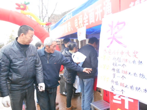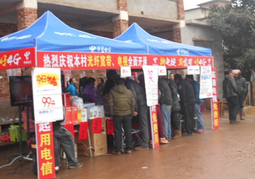 上午10点30分,尽管寒气袭人冷雨飘飘,在凤山村举行的“光纤宽带”开通仪式上,电信开展的“手机话费缴电信,20M宽带免费用,高清电视免费看”的优 惠促销活动中,吸引了不少村民前来演示柜台前参加视频互动、了解咨询。张大爷受在深圳打工的儿子委托,因为儿子准备春节前辞工回家搞种养专业合作社,老张 现场办理了一套价值1490元的惠民大礼包,加装了两台全网通4G智能手机,除免费得到一台路由器外,抽奖还中了一个电饭煲。老张竖起大拇指高兴地夸奖 说:“电信产品真实惠!电信服务真周到!!”。