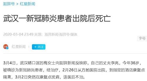 原标题:《武汉一新冠肺炎患者出院后死亡》