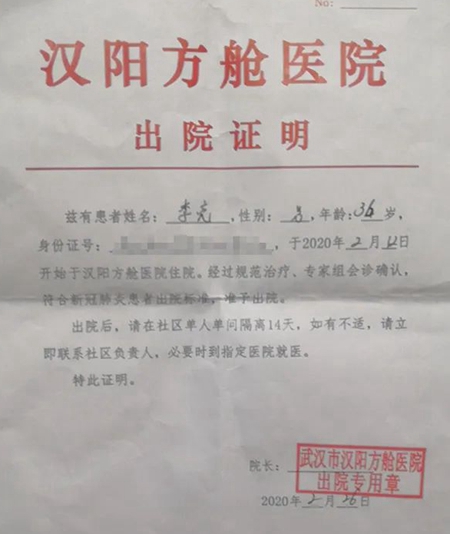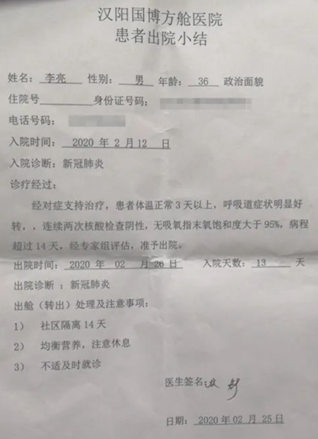 汉阳方舱医院2月26日开具的出院证明显示,李亮2月12日开始在汉阳方舱医院住院,经过规范治疗、专家组会诊确认,符合新冠肺炎患者出院标准,准予出院。出院证明提醒:出院后请在社区单人单间隔离14天,如有不适,请立即联系社区负责人,必要时到指定医院就医。