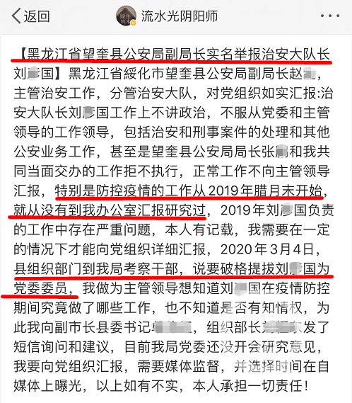 举报帖称,刘某国在工作中不服从局党委和主管领导的领导,包括治安和刑事案件的处理和其他公安业务工作,特别是防控疫情工作开始后,刘某国从未到赵某办公室汇报研究过。