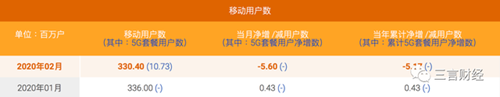 中国移动公布的数据显示,2月份当月,中国移动移动用户净减725.4万户,累计达到9.42161亿户;中国移动4G客户数净减1247.4万户,累计达到7.4537亿户;5G用户净增866.3万户,累计达到0.15399亿户;有线宽带用户净增33万户,累计达到1.88601亿户。