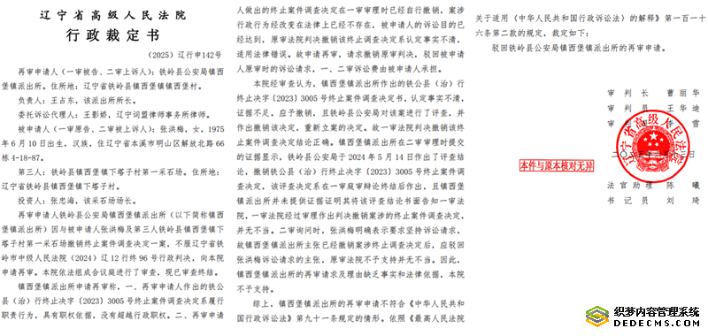 镇西堡派出所不服一审判决提起上诉。2024年9月20日,辽宁省铁岭市中级法院以(2024)辽12行终96号判决书维持原判,指出派出所的上诉请求及理由无事实和法律依据。即便如此,派出所仍坚持申诉,2025年6月13日,辽宁省高级法院作出(2025)辽行申142号判决,再次确认一审裁判正确,驳回其再审申请。