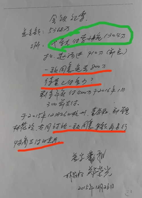 但是,郑崇光一直还再向董学和索要“欠款”。为了清算一下“欠款”问题,2015年12月26日,董学和、郑崇光、林筱玲三人共同开会碰头清算,并达成共识,签订了《会议纪要》(如下图)。