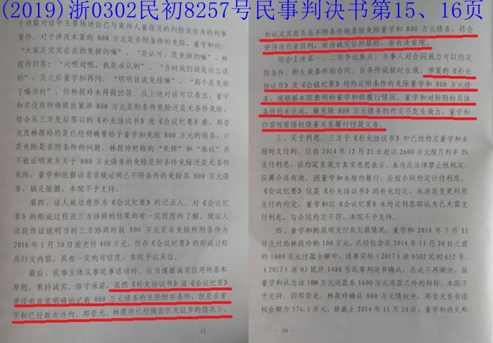 另外,法院还对董学和与林筱玲的通话录音进行了阐述。“法院认为”中也表述:董学和问:“大家是实实在在的免掉的嘛?”“是认可,是免掉的嘛?”林筱玲回答:“对呢,对呢,我是承认的”。通过这段录音对话,已经充分说明对免掉800万问题,林筱玲一直是承认和认可的,是林筱玲真实意思的表达。