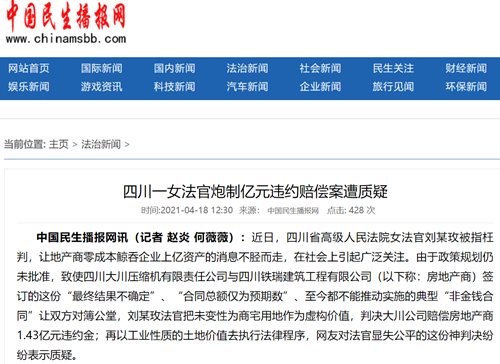 中国民生播报网讯(记者 赵炎 何薇薇):近日,四川省高级人民法院女法官刘某玫被指枉判,让地产商零成本鲸吞企业上亿资产的消息不胫而走,在社会上引起广泛关注。由于政策规划仍未批准,致使四川大川压缩机有限责任公司与四川铁瑞建筑工程有限公司(以下称:房地产商)签订的这份“最终结果不确定”、“合同总额仅为预期数”、至今都不能推动实施的典型“非金钱合同”让双方对簿公堂,刘某玫法官把未变性为商宅用地作为虚构价值,判决大川公司赔偿房地产商1.43亿元违约金;再以工业性质的土地价值去执行法律程序,网友对法官显失公平的这份神判决纷纷表示质疑。