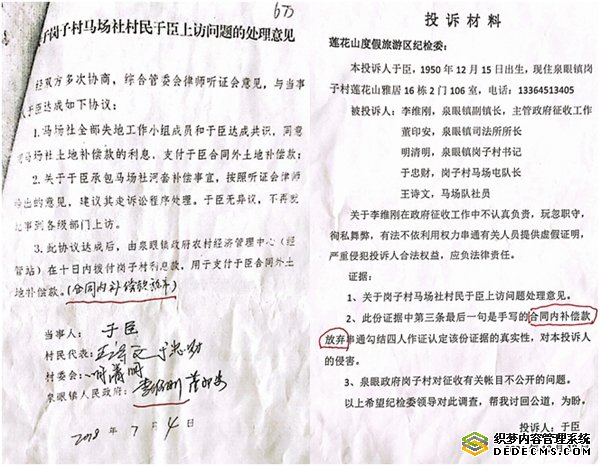 在一份《泉眼镇岗子村马场社村民于臣上访问题的处理意见》中,记者看到这样的字样:“经双方多次协商,综合管委会律师听证会意见,与当事人于臣达成如下协议:1,马场社全部失地工作小组成员和于臣达成共识,同意用马场社土地补偿款的利息,支付于臣合同外土地补偿款;2.关于于臣承包马场社河套补偿事宜,按照听证会律师给出的意见,建议其走诉讼程序处理。于臣无异议,不再就此事到各级部门上访。3.此协议达成后,由泉眼镇政府农村经济管理中心(经管站)在十日内拨付岗子村利息款,用于支付于臣合同外土地补偿款。落款处日期是2018年7月4日。