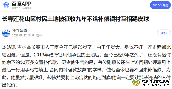 本站讯 吉林省长春市人于臣今年已经73岁了,由于年岁大、身体不好,连走路都比较困难。但是,2013年政府征用他承包的土地后,至今已经9年之久了,还没有给付他余下的52万多安置补偿款。更令他生气的是,有位副镇长还在上访问题处理意见上最后一行用手写笔填上“合同内补偿款放弃”的字样,使他至今也要不回来补偿款,为此,他虽然步履艰难,却依然要将上访告状的路走到底!他说一定要让那些违法的人付出代价。