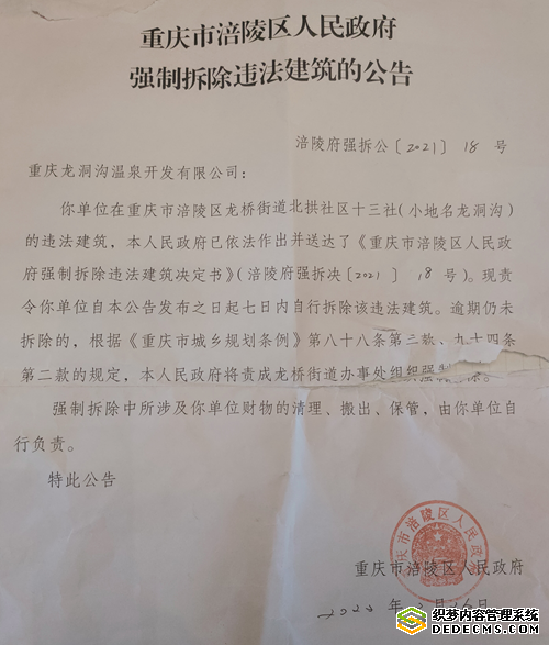 从2020年开始,涪陵区城管局又向龙洞沟温泉城企业发出一系列文书,包括:限拆违章通知、决定、公告,但时至今日没有任何一个部门和工作人员与投诉人协商拆迁事宜。2022年10月26日,涪陵区政府指派龙桥街道办理处和城市管理执法大队在温泉城门口张帖了强拆公告,限期七天之内自行拆除,否则责成龙桥办事处强制拆除。同日,相关部门在未经企业知晓和同意的情况下,擅自闯入企业内部拍照并驱赶员工,并且政府协同水电气部门通知企业将要被停电、停气、停水。