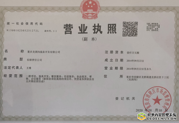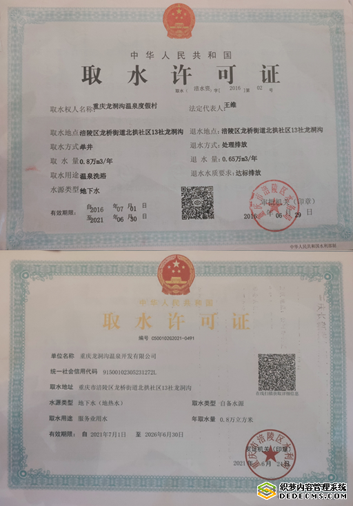同时还取得涪陵区水利局两次温泉取水许可证:第一次取水编号:涪水资字2016第02号,第二次取水编号C500102G2021—0491时间2021年6月24日。这些手续完善后,夫妻二人在外大量筹集资金六千余万左右,全力投入宣传和基础设施建设。