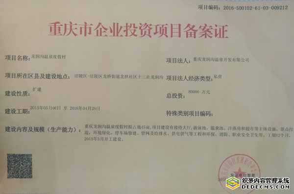2015月3月16日,涪陵区政府龙桥街道办事处出具红头文件,龙桥街道发[2015]46号红头文件,文件内容第二条明确说明:“加快龙洞沟生态酒店旅游产品开发,积极支持,鼓励龙洞沟生态酒店旅游产品开发投入,加快龙洞沟生态酒店旅游设施建设步伐,力争在2015年上半年建成并投入使用,把龙洞沟生态酒店建设成为涪陵乃至重庆具有特色和影响力的休闲度假旅游品牌”。龙洞沟生态酒店当时还被重庆市评为五星级乡村洒店。