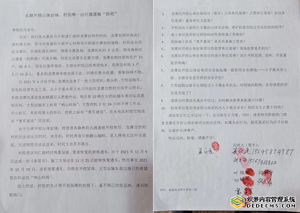 自2021年4月份开始,龙潭坑进来了一批大型挖机、炮头机、大型运输车,发电机组等作业工具,从小子溪水库入水口开始向龙潭自然村方向开山挖石,并将龙潭坑溪流里的裸露石头悉数外运,每天有10辆左右的运输车来回运送建筑石料,大型运输车上标有“响山料场”的字样。大型挖机2台24小时不停工作业,开山挖石,有时用黑火药炸石。挖机上标有“奥军建设”字样,在水电站对面空地设有“奥军建设”项目部。由于这些人大肆开挖山体岩体,致使原有森林防火通道被开挖殆尽,龙潭自然村村民无法进出自然村,村民进出只能翻山越岭,老人得病无法外出就医,生活物资无法运进来,村民生活苦不堪言。为了解决这一问题,村民们曾多次向仁源村两委反映,要求恢复机耕路通车,并于2021年11月9日与施工方达成一份《承诺书》,施工方保证在当年的11月25日能够恢复通车,然而施工方至今未能将道路修通。在十分无奈的情况下,去年上半年,村民们通过集资,筹集到266300元,花费310180元(净亏43880元)终于将道路修通了。然而,涉嫌非法采矿并将道路阻断的嫌疑人至今仍未受到任何刑事处罚。