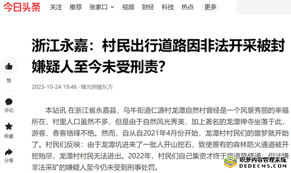 本站讯 在浙江省永嘉县,乌牛街道仁源村龙潭自然村曾经是一个风景秀丽的幸福所在,村里人口虽然不多,但是由于自然风光秀美,加上著名的龙潭禅寺坐落于此,游客、香客络绎不绝。然而,自从自2021年4月份开始,龙潭村村民们的噩梦就开始了。村民们反映:由于龙潭坑进来了一批人开山挖石,致使原有的森林防火通道被开挖殆尽,龙潭村村民无法进出。2022年,村民们自己集资才终于将道路修通,但涉嫌非法采矿的嫌疑人至今仍未受到刑事处罚。