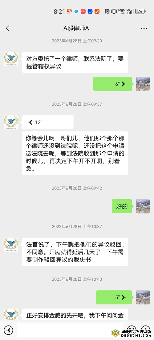 6月28日上午9点37分,就在孙荣增整装待发的时候,邬律师微信通知孙荣增先别去经开区法院,称对方律师已向法院提出管辖权异议,异议申请书送到法院之后才能决定下午能否开庭。