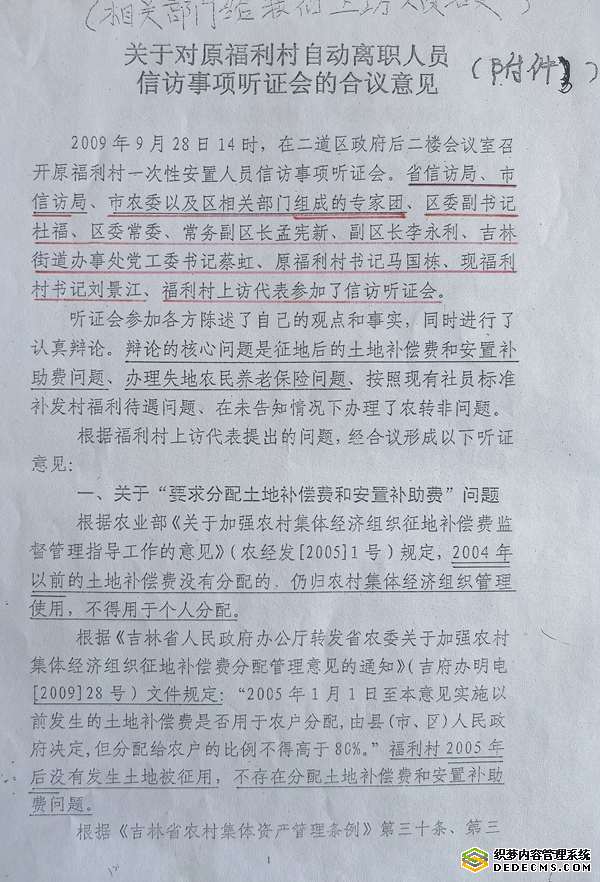2009年9月28日14时,二道区政府在后二楼会议室召开了原福利村一次性安置人员信访事项听证会。省信访局、市信访局、市农委以及区相关部门组成专家团,还有区委、街道办事处、福利村的有关人员都参加了听证会,福利村的上访代表也在听证会现场。
