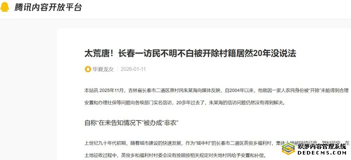 本站讯 2025年11月,吉林省长春市二道区原村民朱某海向媒体反映,自2004年以来,他就因一家人农民身份被“开除”未能得到合理安置和办理社保等问题向各级部门实名信访,20多年过去了,朱某海的信访问题仍然没有得到解决。