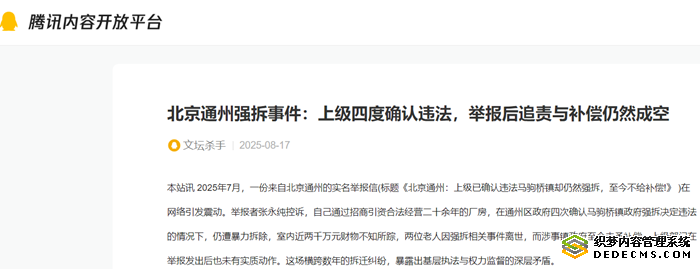 本站讯 2025年7月,一份来自北京通州的实名举报信(标题《北京通州:上级已确认违法马驹桥镇却仍然强拆,至今不给补偿!》 )在网络引发震动。举报者张永纯控诉,自己通过招商引资合法经营二十余年的厂房,在通州区政府四次确认马驹桥镇政府强拆决定违法的情况下,仍遭暴力拆除,室内近两千万元财物不知所踪,两位老人因强拆相关事件离世,而涉事镇政府至今未予补偿,上级部门在举报发出后也未有实质动作。这场横跨数年的拆迁纠纷,暴露出基层执法与权力监督的深层矛盾。