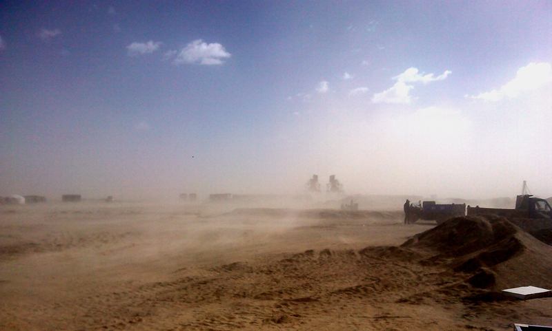 “白色的云朵在飘,云朵下面,高原天路宛如一条巨龙,在云端山际蜿蜒盘旋。”沿着303省道一路向西,我们极力寻找着那些引人入胜的至美风景,试着去体会 那份神圣的情怀,一切似乎恰恰相反。连续颠簸340余公里后,空旷荒寂的戈壁里几顶帐篷若影若现,整齐划一的几排板房在空旷的戈壁滩显得格外的亲切。原本 晴朗的天气大变,狂风开始肆虐,暖阳瞬间降温,天地开始灰暗阴沉起来,伴随而来的就是令人窒息的飞尘味,弥漫在整个戈壁滩。一面阳光照耀,一面风沙起舞, 飞起的砂砾打在车窗上,发出“当当”的声音,望着不远处的家,初到人员多少有些失望。