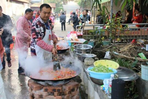 上午十时许,记者来到自由村,现场看到人山人海,空前盛况,交警、特警在维持秩序,做菜区域拉起警戒线由特警把守,无工作牌的一律不得进入,区食品药品监督管理部门也专门派出工作人员现场值守,确保菜品卫生安全,村上专门为外地来客准备有桌子、板凳、碗、筷等,本村村民则自带,据村书记韩成高介绍:“今年我们准备了400桌,杀了10头猪、鸡和鸭各杀100只,煮了1200斤的大米饭,从现在看外来客人要超过了本村村民。“龙肉宴”开席前,南溪区委副书记、区长李廷根也亲临现场,对“龙肉宴”前期工作给予了肯定,同时要求举办者按照既定方案确保所有来客的食品卫生安全。
