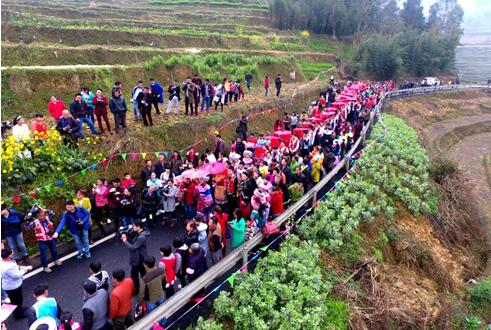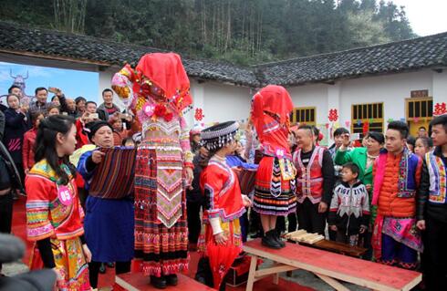 在女方,早已梳妆打扮好的33名新娘由伴娘陪着,在苗族长老主持的“打生”仪式结束后,新娘盖上红头巾,依依不舍地拜天地、拜父母、拜众亲友,经过“踩斗、丢筷子、过桥梁”等隆重的仪式,由新娘的兄长将新娘背出家门,此时伴娘打开红伞递给新娘撑着,走在最前面的送亲婆领队“吼总持伞”,带领送亲队伍向新郎家走去。